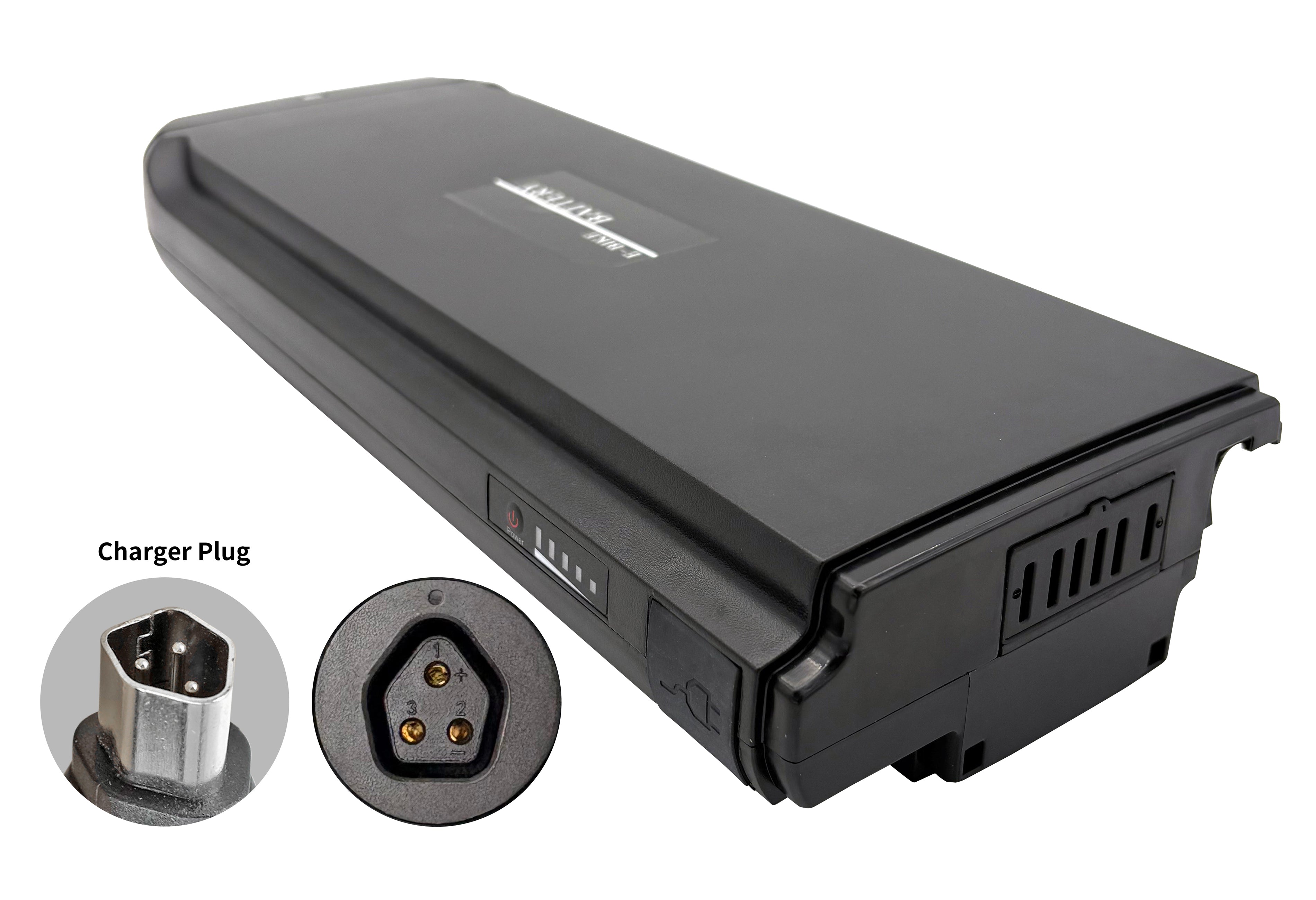 Deze accu is ontworpen voor een 36-volt systeem gemonteerd op de bagagedrager.